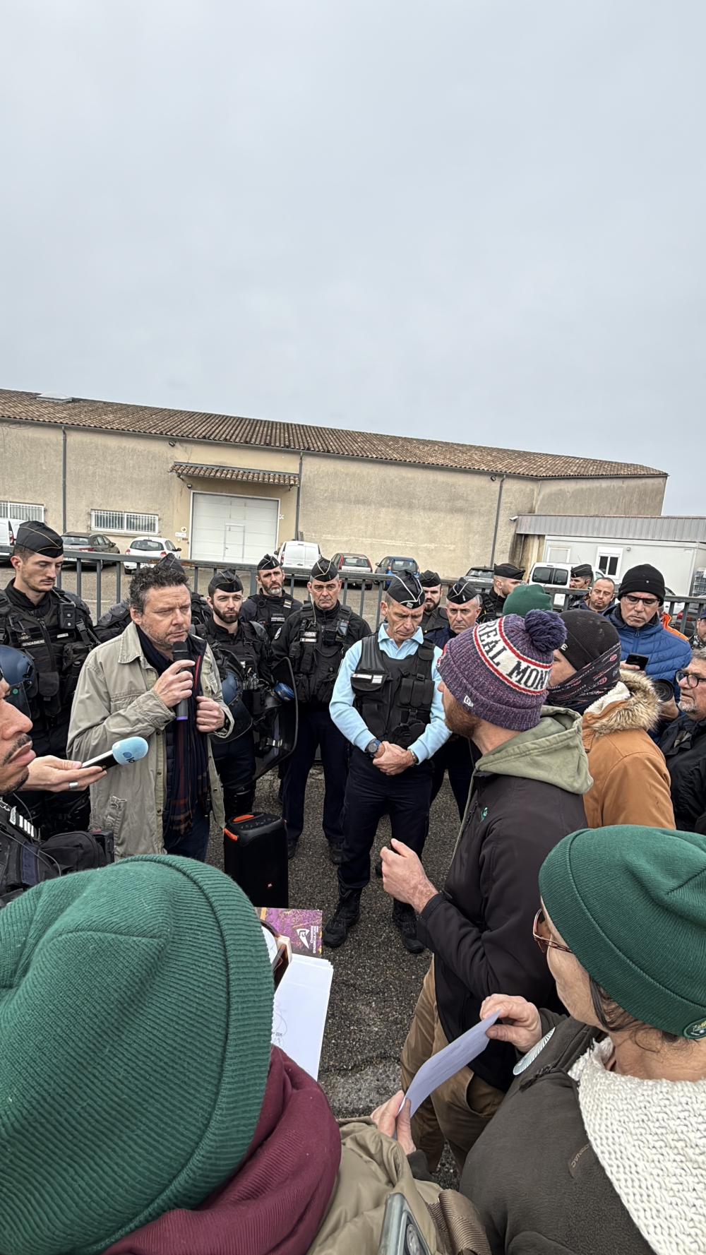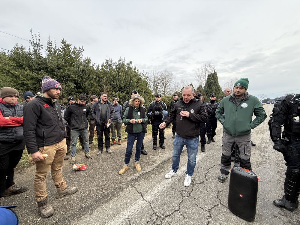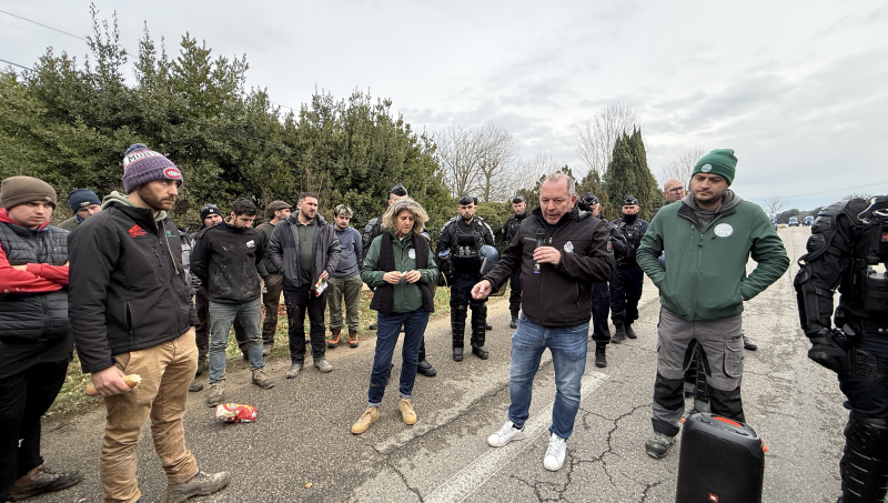 À Châteauneuf-du-Pape, face à Samuel Montgermont, à la tête du syndicat professionnel des négociants de la Vallée du Rhône, la tension était palpable et le cordon de sécurité de la gendarmerie sur le qui-vive. Vauclusiens, Drômois comme Gardois n'ont pas mâché leur mot, rendant coup pour coup. "La crise touche toute la filière. Je peux vous garantir que, depuis deux ans, j'ai travaillé. On a fait des avances qu'on veut sécuriser sur la rémunération", a commencé par assurer le négociant. Pourtant, la réponse ne s'est pas fait attendre de la foule. Première salve : "Les accords de durabilité ne sont pas encore en activité que vous trichez déjà !" Et deuxième salve, sur les prix cette fois : "Il y a deux ans, on nous a dit que c'était à cause de nos stocks. Depuis, on n'a jamais eu de stocks aussi bas, mais les prix, eux, le sont. Rien ne change", clame le groupe, en ébullition, attendant des réponses.